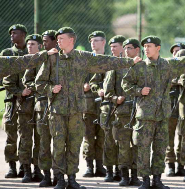 Myös uusille suomalaisille maamme puolustaminen ulkoista uhkaa vastaan on tärkeää. Kuva puolustuvoimien julkaisusta ”Eri tausta, sama tahti –monimuotoisuus puolustusvoimissa”.