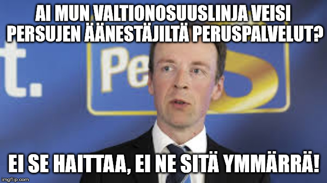 Mitä olet saanut, kun olet äänestänyt perussuomalaisia? Kuinka paljon perussuomalaiset ovat tuottaneet onnellisuutta ja hyvinvointia tähän maahan? Kuinka moni vaalilupaus on täyttynyt? Tuskin monikaan ja jos joku onkin, sen lisäksi on tullut niin paljon vääryyttä ja pahaa, että sen tuoma hyvä on jo moneen kertaan kumoutunut. Onko perussuomalaisen antama vastine äänellesi vain se, että saat lukea ja kuunnella rumia? Sillä tapaako ajattelit Suomen muuttuvan lapsillesi paremmaksi paikaksi elää?