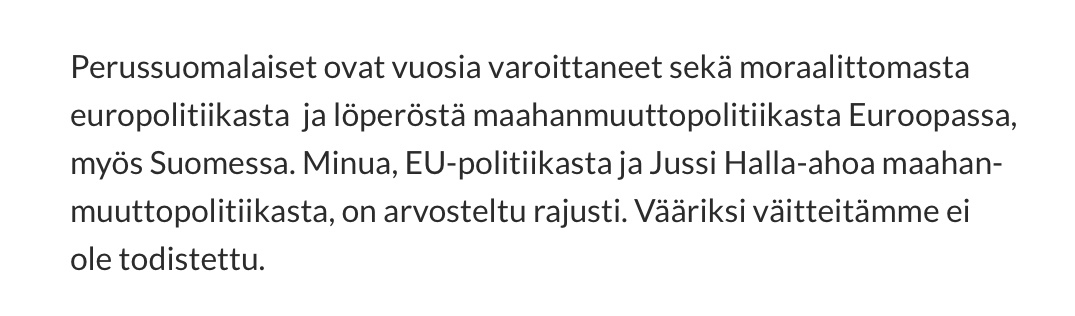 Timo Soini kirjoitti blogissaan 20.9.2015 otsikon ”Maahanmuuttolinja kiristyy huomattavasti” alle seuraavasti: ”Perussuomalaiset ovat jo vuosia varoittaneet sekä moraalittomasta europolitiikasta ja löperöstä maahanmuuttopolitiikasta Euroopassa, myös Suomessa. Minua, EU-politiikasta ja Jussi Halla-ahoa maahanmuuttopolitiikasta, on arvosteltu rajusti. Vääriksi väitteitämme ei ole todistettu”.