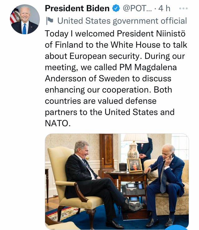 Presidentti Niinistön kanssa neuvotellessaan presidentti Biden halusi yllättäen soittaa Ruotsin pääministerille, Magdalena Anderssonille. Hänen kanssaan Biden oli jo tavannut turvallisuuspoliittisissa asioissa ja luvannut Ruotsille ehdotonta tukea. Presidentti Biden halusi ottaa Suomen ja Ruotsin johdon yhdessä turvallisuusyhteistyöneuvotteluihinsa. Sekin oli osoitus siitä, että vähän vanhoillisemmankin maailmanmahdin johto on nykyisin hyvin tietoinen siitä, että kaikki asiat hoidetaan naisjohtajien kanssa siinä missä miestenkin.