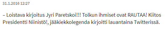 Kansallissankari Teemu Selänne jakoi v. 2016 kaverinsa Aleksi Valavuoren kanssa maahanmuuttajia törkeällä tavalla mustamaalaavaa tekstiä, vaati maahanmuuton rajoittamista ja väittipä maahanmuuttajien joukkoraiskanneen ystävänsä tyttären. Rikosta ei ollut poliisitutkinnassa eikä Selänne suostunut myöhemmin todistamaan väitteitään. Mitään seuraamuksia tuollaisesta kansanryhmää vastaan kiihottamisesta ei ollut. ”Tolkun ihmiseksi” presidentti Niinistön suosiollisella avustuksella nostettu Selännehän sai puhua, mitä rasistinen sylki suuhun toi. Aärioikeistolainen väki hurrasi. Kun on rasismin hyväksyvä presidentti kaverina, on lähes koskematon.