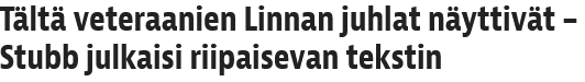 Itsenäisyyspäivän Stubbijuhlien vierasjoukko näytti koostuvan lähinnä presidentin henkilökohtaisista kannattajista, kävely-, pyöräily-, uinti- ja sormenkoukistusvalmentajista ja vaalitukien maksajista. Jopa veteraanien juhlassa Stubbin ”riipaiseva” puhe käsitteli lähinnä häntä itseään: Ilman teitä ei olisi minua, Cai-Göran Alexandra Stubbia, sillä isoisäni tapasi lottansa sotasairaalassa.