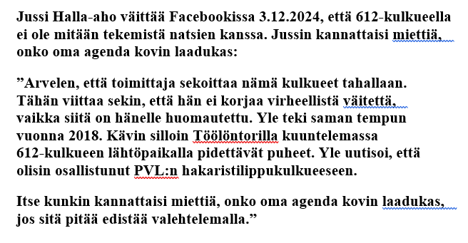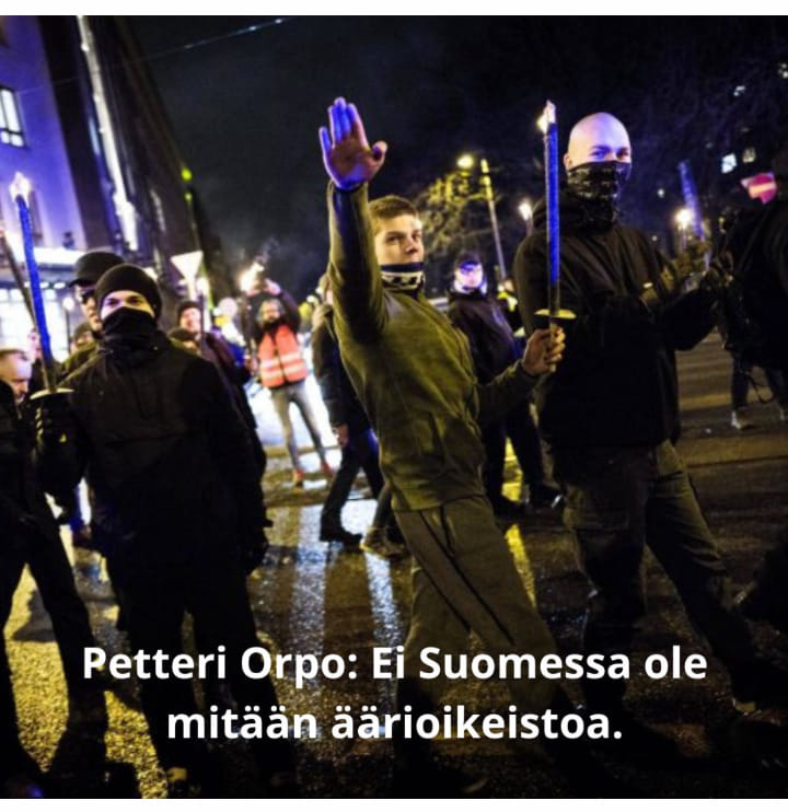 Olemme uusfasismin etenemisessä Suomessa jo niin pitkällä, että rasistien ”mestari” pääsee eduskunnan puhemiehen asemasta suomaan suosionsa natsimarssille. Sieltä hän myös tyrkkii mediaa ja väittää sen valehdelleen, että hän, viaton ”mestari”, olisi osallistunut natsimarssille v. 2018, kun hän vain kävi Töölöntorilla kuuntelemassa puheet. Tuolla eleellä ja kaikella muulla tekemisellä viimeisten 20 vuoden ajan Halla-aho ei tietysti mitenkään ole osoittanut edustavansa suomalaista uusfasistista, rasistista liikettä, jonka tarkoituksena on, niin kuin Halla-aho on julistanut: ”Suomen islamisaation estäminen” ja jonka yksi tavoite on Riikka Purran viimeksi vaaleissa mainostama ”nolla turvapaikanhakijaa”. Tällä ei luonnollisesti tarkoiteta vaikkapa ukrainalaisia, joita suurin osa Purran ja Halla-ahon aatetovereista ei heidän ihonvärinsä vuoksi vielä laske ”haitallisiin ihmisiin”.