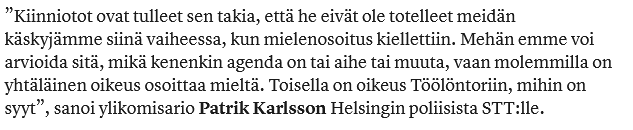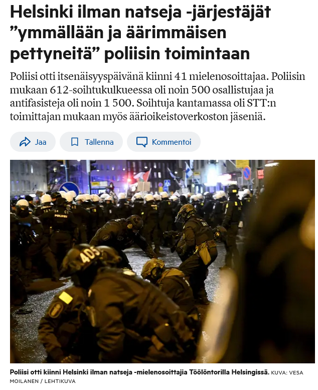 Mielen osoittaminen uusfasisteja ja rasisteja vastaan ei ole anarkiaa, kommunismia eikä islamismia. Ei riitä myöskään se, että mennään ja marssitaan kauniisti vastaan. On tarpeen käyttää myös passiivista vastarintaa, jos poliisi osoittaa turvaavansa vain natsien oikeuden mielen osoittamiseen, aitaa heille Töölöntorin, riistää vastamielenosoittajilta lippuja ja heittää ne aidan toiselle puolelle natsien poltettaviksi. Helsingin poliisi on itsevaltaisesti suonut natseille oikeuden varata Töölöntorin omaan käyttöönsä itsenäisyyspäivinä hamaan tulevaisuuteen. Vastamielenosoittajiin poliisi suhtautuu karsaasti ja on osoittanut neuvotteluissa järjestäjien kanssa ylimielisyyttä ja halveksuntaa. Siksi on tullut tarpeelliseksi yhä enemmän harjoittaa kansalaistottelemattomuutta. Ei ole oikein, että poliisi kehottaa kunniallisia ihmisiä poistumaan turvatakseen natseille leveämmät oltavat Helsingin kaduilla. Ymmärrän, että väkivallan uhka on selvä, jos natsijoukkiot kohtaavat vastamielenosoittajat kadulla, ja toisella puolellakin on tappeluhalukkaita. Siksi poliisin läsnäolo on tarpeen, niin kuin yleensä mielenosoituksessa.