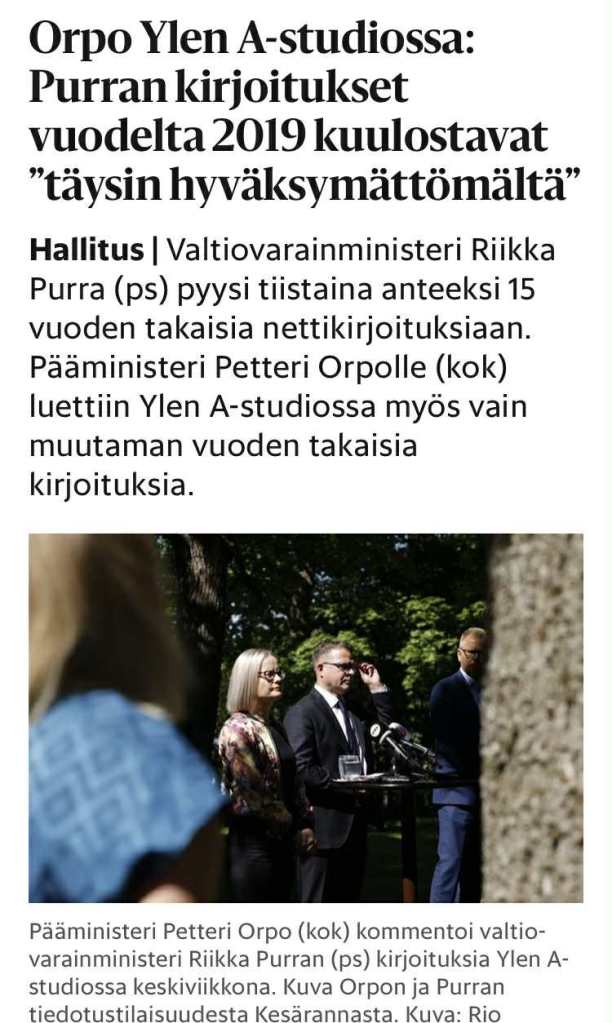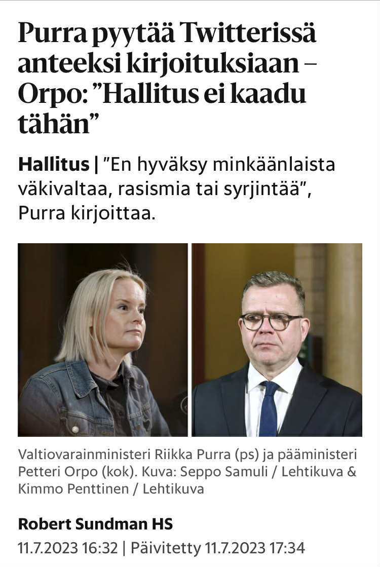 Ensin yritettiin homma laittaa Purran nuoruuden piikkiin, mutta kun Orpo sai toimittajilta kuulla tuoreemmistakin rasistisia kirjoituksia, Orpo joutui toteamaan, että eihän tuollaista tekstiä voi ymmärtää tai sallia.