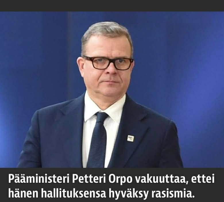 Finland has a racist, neo-fascist government, led by Petteri Orpo. Mr. Orpo’s apologies and statements are false and baseless. Racism in Finland will spread and become more brutal as long as racists are in power.