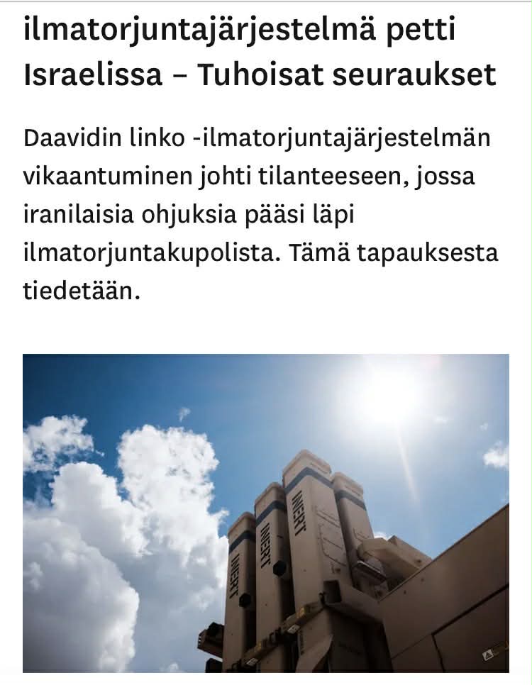 Uskokoon ken tahtoo. Suomi kertoo innoissaan koko maailmalle hävittäjätilausten määrät ja saapumisaikataulut. Maailman paras ohjusten torjuntajärjestelmä, pyhä israelilainen Daavidin linko on julkisesti ylpeillen tilattu, eikä tilausta kansanmurhaajavaltiolta vieläkään peruttu, vaikka se taas seitsemän päivää sitten petti Israelin omassakin ohjustorjunnassa.