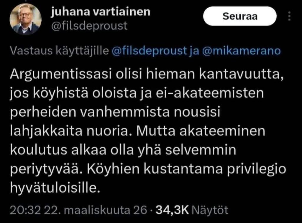 Väki on saatu riittävästi pelkäämään. Valtion varat voidaan nyt sijoittaa isänmaallisesti. Heikompilahjaisia ei kannata liikaa kouluttaa, riittää, että kokoomusvesat menevät yliopistoon. Köyhien hyysääminen on jo lopetettu.